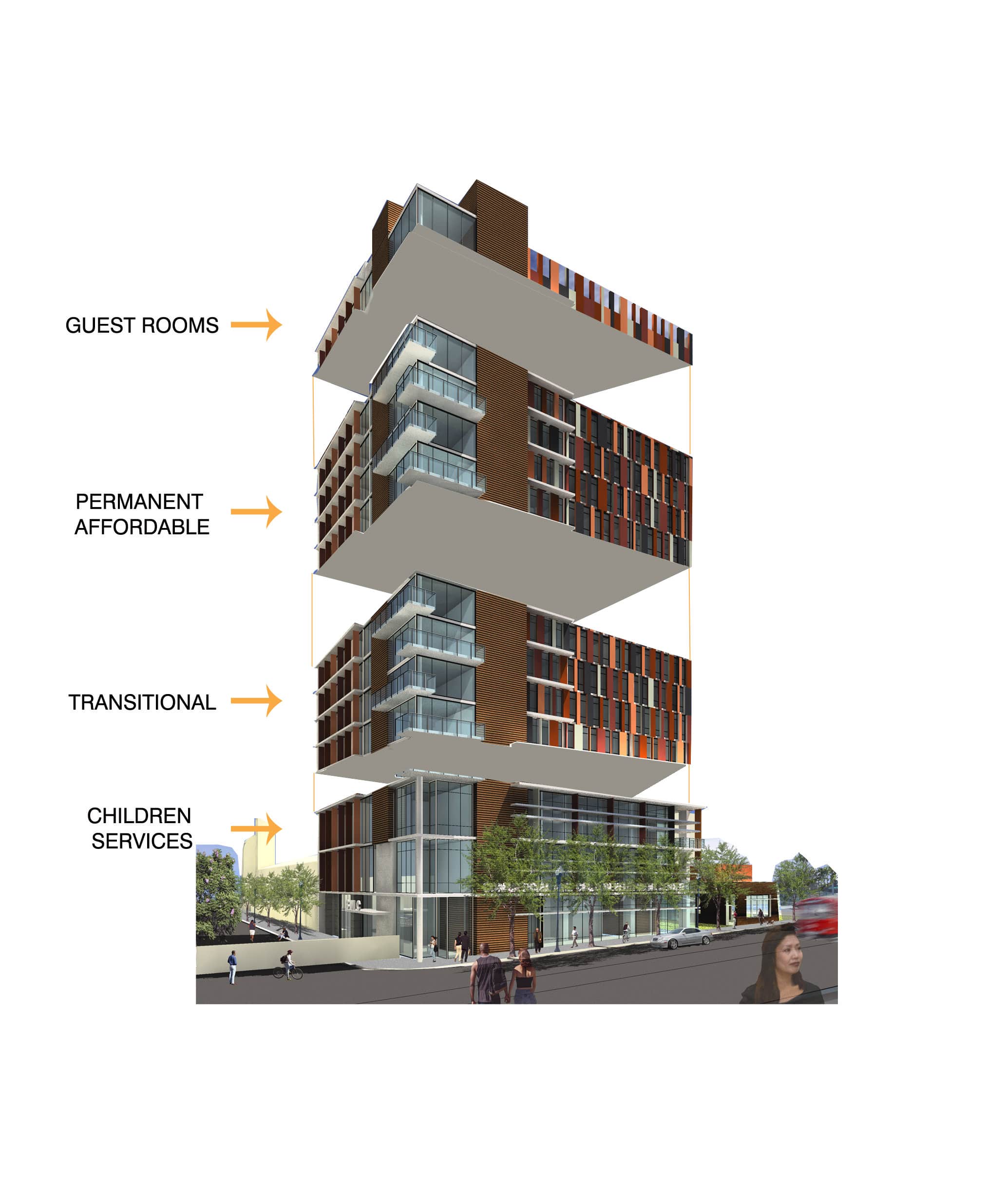 The major goal and planning objective for this complex was to provide contemporary and more dignified housing to the economically challenged population experiencing homelessness and a building that fits into the urban context from a design and programming standpoint.