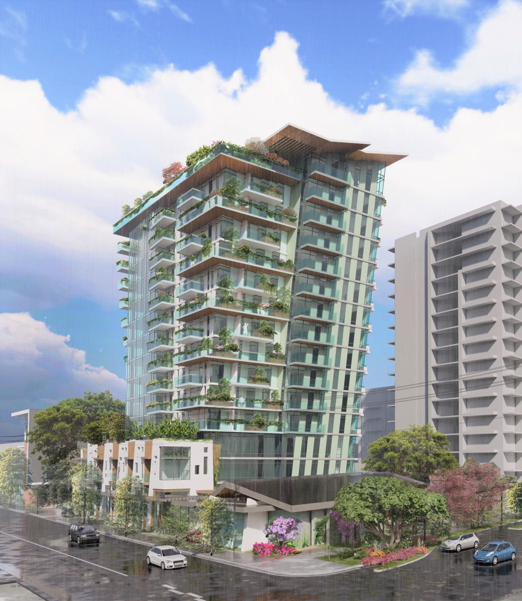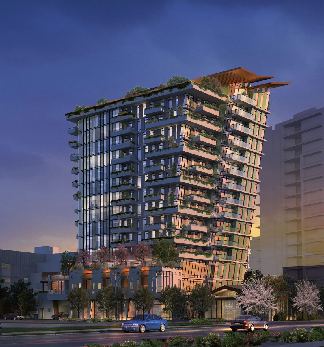 Eastern frontage will serve as its most iconic architectural element. The angled 15-storey design –leaning to the east from its footprint on land formerly occupied by the McCall Brothers Funeral Home, will be an architectural first for Victoria where a building as prominent as the 50-metre tall high-rise will literally hover over its foundation and an adjacent 1960’s-era funeral chapel designed by famed Victoria architect John Di Castri.