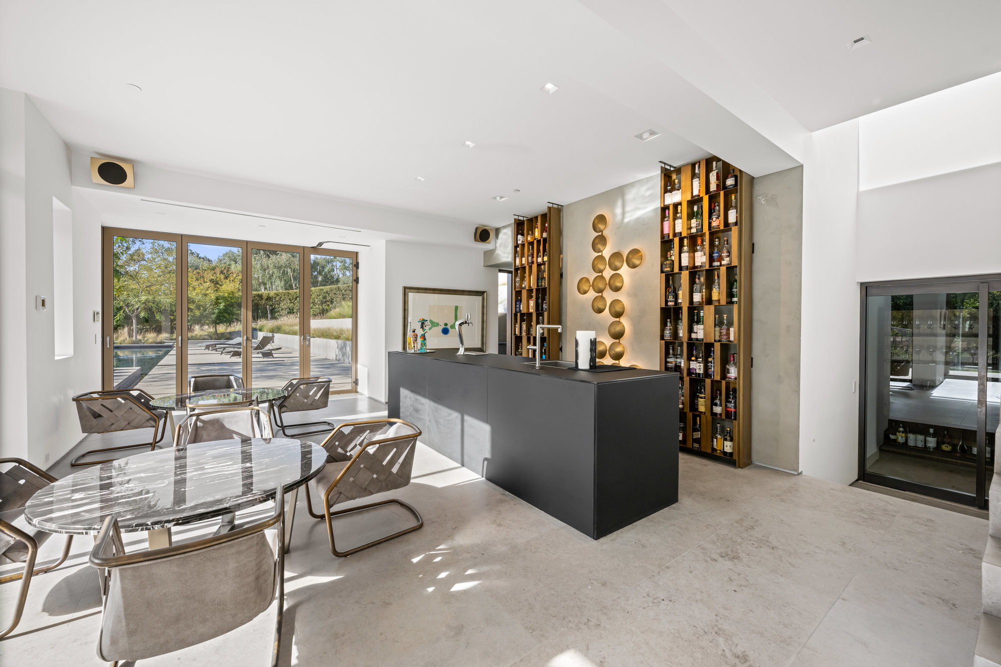 A wide, patina copper door pivots open, ushering guests into a foyer with limestone flooring. From the front of the home, a concave wall of gold quartzite serves as a buffer to provide privacy from the street and incorporates deep-set angled windows to create patterns of light and shadow inside.