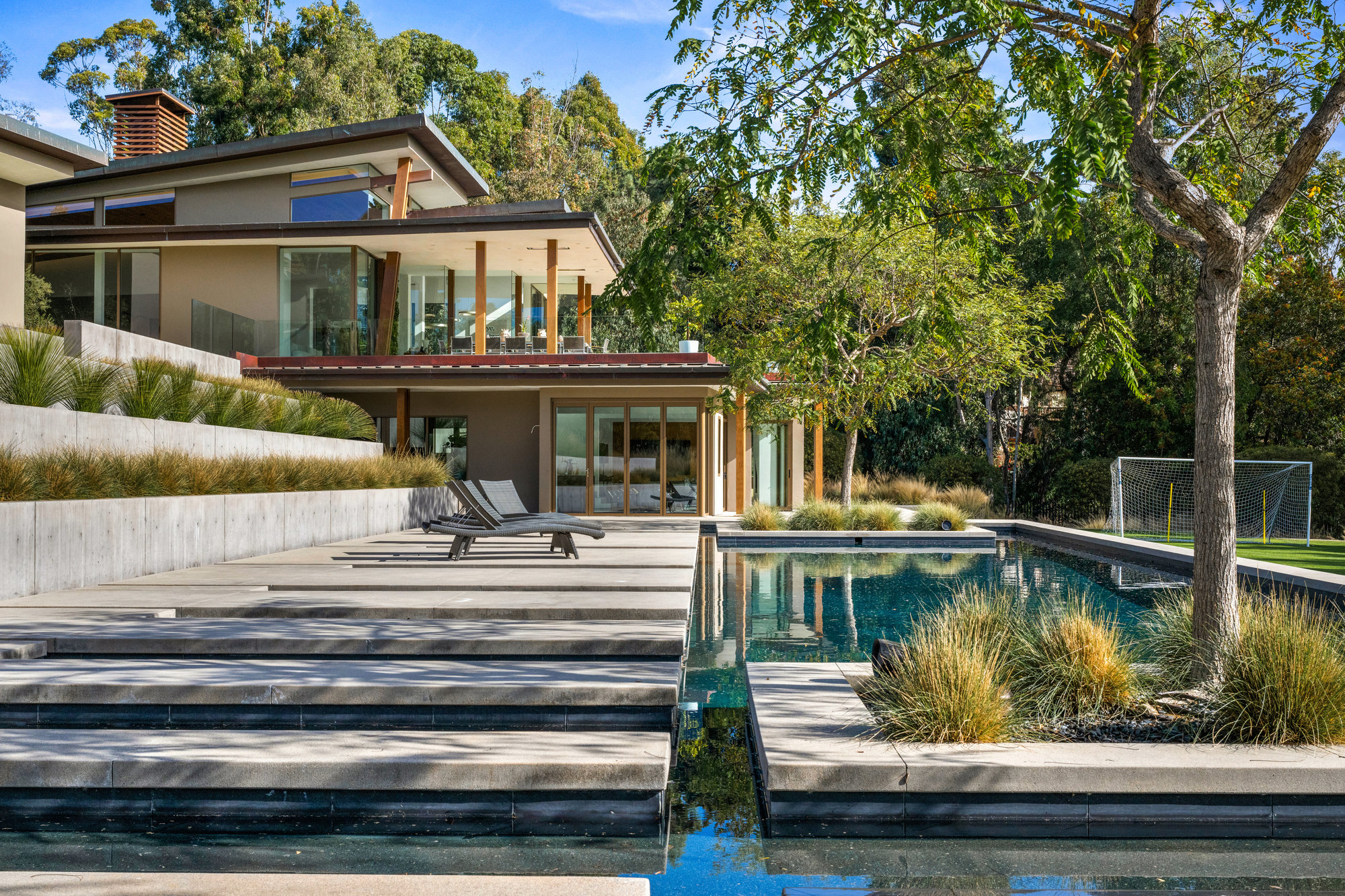 In dramatic contrast to it’s humble street-side façade, the rear of the residence is a series of mahogany-framed, soaring glass expanses for an indoor-outdoor feel. Copper roof panels visually enhance the fan-like shape of the home. Glass rails preserve the deck’s views of the pool, eucalyptus-wooded hills, horseback riding trails and a placid lake.